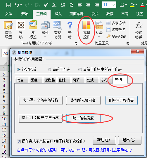 EXCEL必备工具箱, 统一姓名宽度功能,批量将所选区域内两个字的姓名内添加全角空格(如果添加的普通空格,会造成不同字体下不能对齐),使得两字姓名与三字姓名同样宽度,更加美观,更加符合中国人习惯。