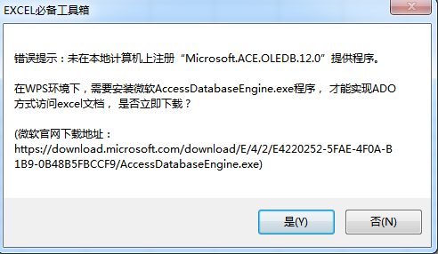 15.84版改进:在WPS环境下,需要安装微软AccessDatabaseEngine.exe程序,才能实现ADO方式访问excel文档,,在出现提示未在本地计算机上注册“Microsoft.ACE.OLEDB.12.0”的错误时,会预先提示从微软官网下载相关程序。