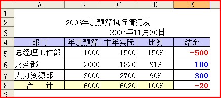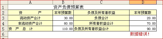 比较典型的情况,就是用excel填写资产负债预算表,你想呀,这张表的许多数据等于其他表中的数据,其他表数据一改动,这张表就的动,但有一条,资产=负债+所有者权益。在下图中,只要资产不等于负债+所有者权益,就会用红字显示“数据错误!”,如果相等就什么都不显示。