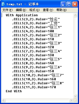 <5>系统会生成代码,并用记事本予以显示,例如以cells(行,列)方式: