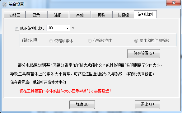 部分电脑通过调整"屏幕分辨率"的"放大或缩小文本或其他项目"选项调整了字体大小,导致工具箱窗体上的字体大小异常,可以在这里通过修改为与系统一样的比例来修正。