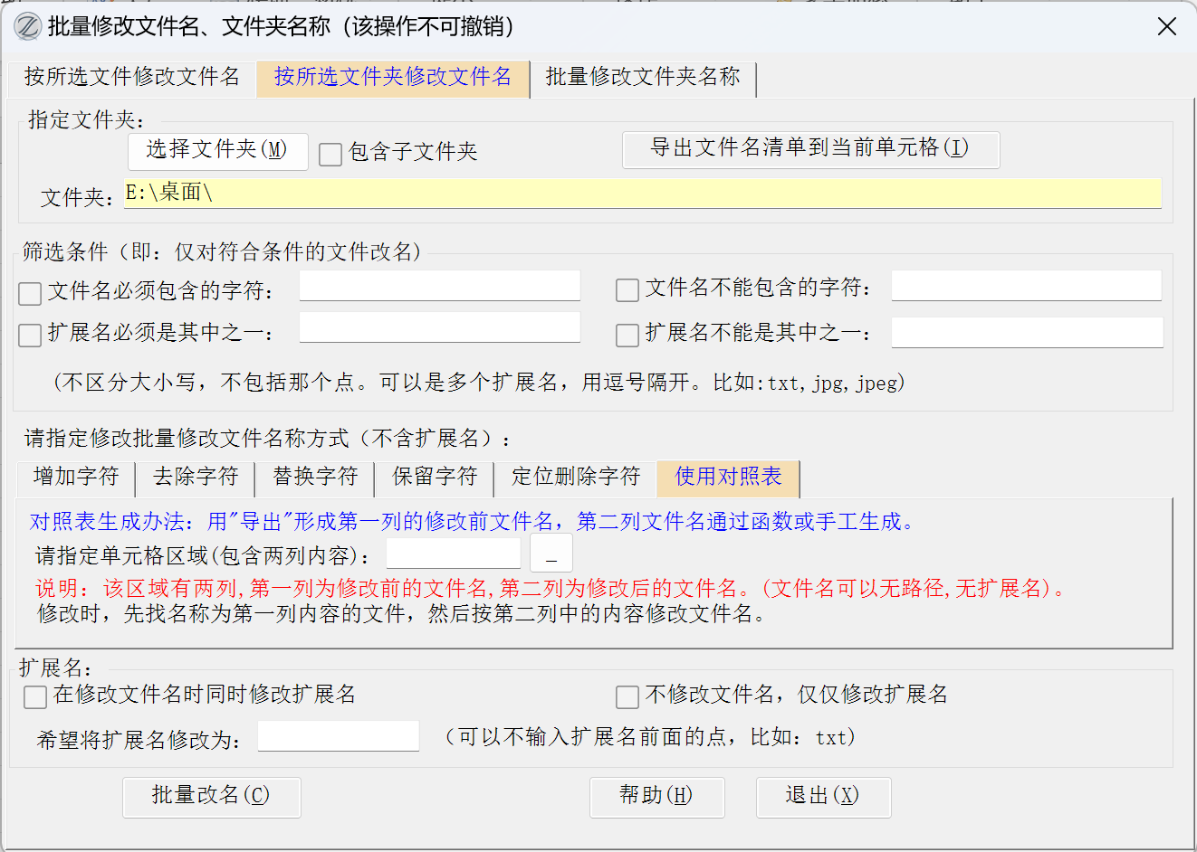 15.70版改进:按所选文件夹改名选项卡下,按对照表方式改名,如果待修改的文件名和原来的文件名相同,会有错误提示,已经改进。