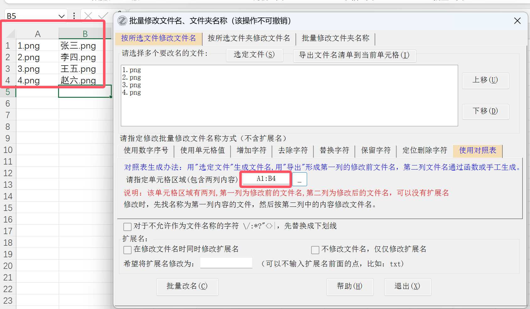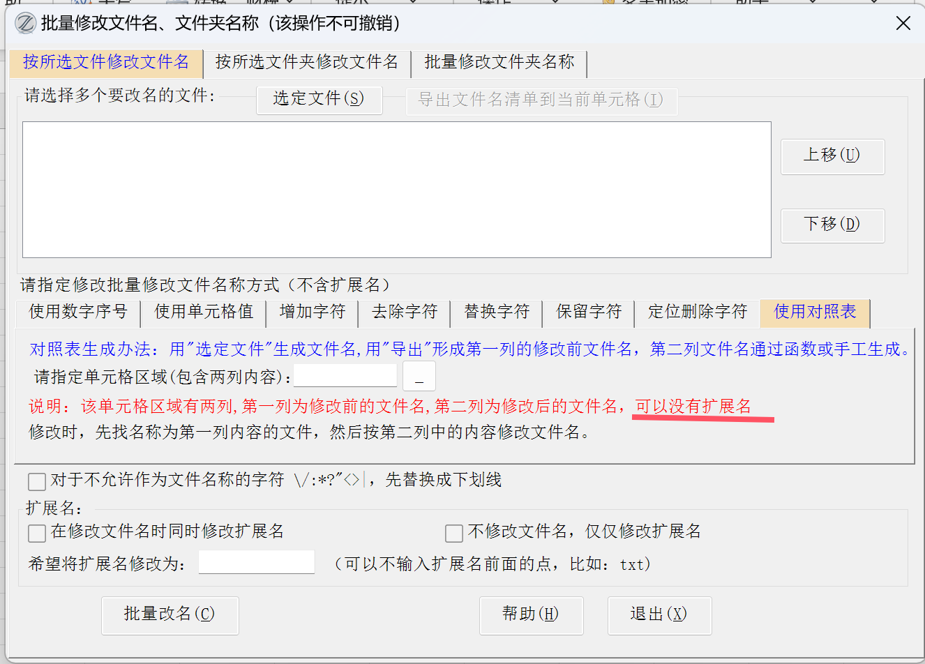 19.20版改进:【按所选文件修改文件名】、【按所选文件夹修改文件名】这两种方式下的【使用对照表】修改文件名时,对照表的两列数据可以不带扩展名。