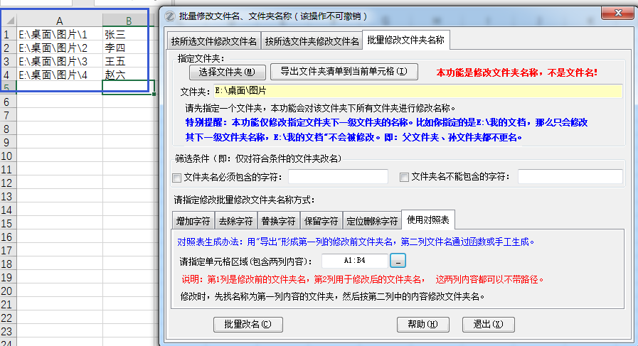 (2)编辑对照表区域,第一列是待改名的文件夹名称,第二列是希望修改后的文件夹名称。