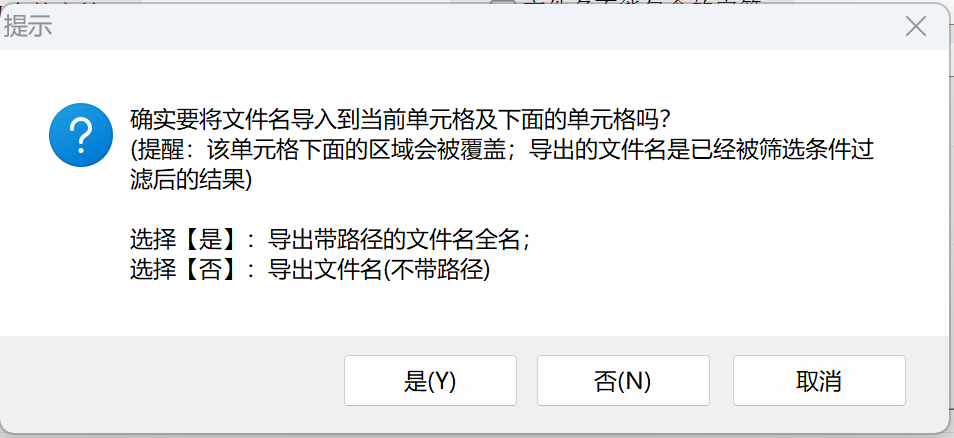 选择【是】:导出带路径的文件名全名;选择【否】:导出文件名(不带路径)
