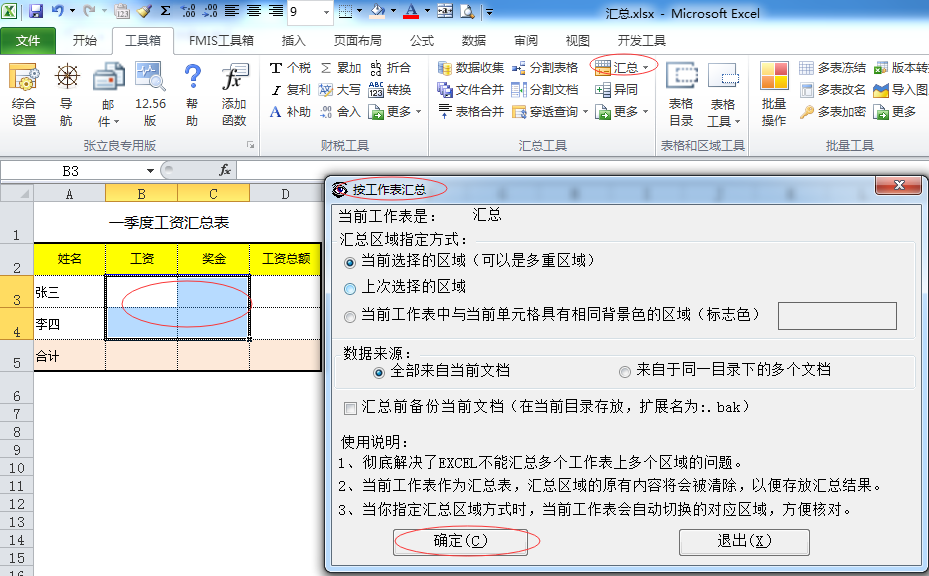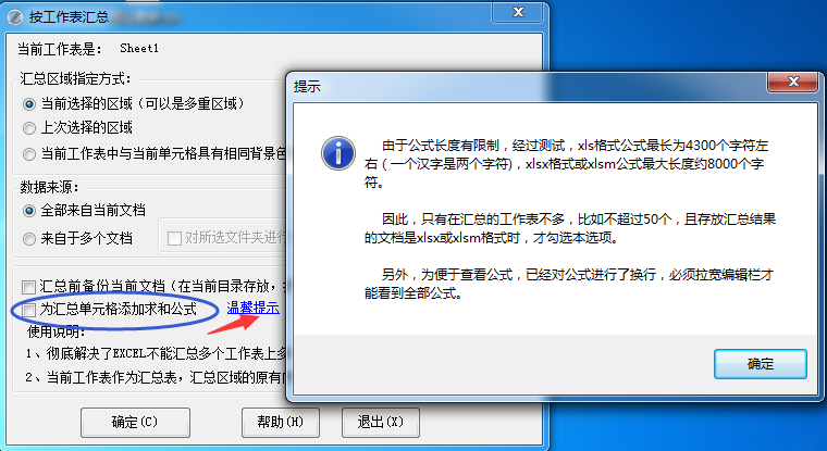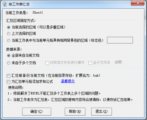 进行过以上准备工作后,点击“按工作表汇总”按钮,出现确认选择表格、选区的窗体,点击确定。