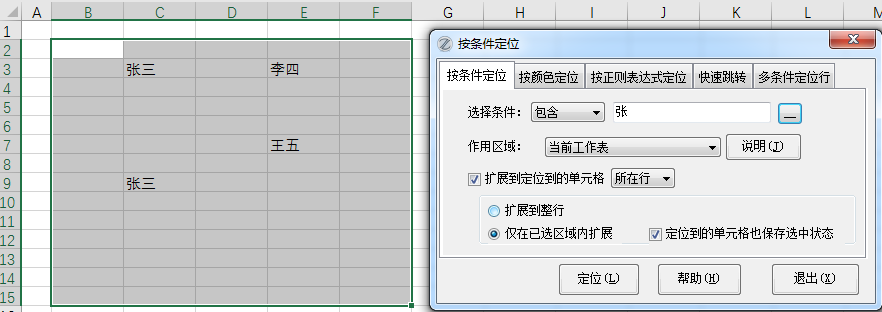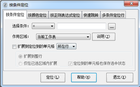 本功能可以让您随心所欲选择定位条件。操作时请首先选择运算符,然后输入定位值(可以使用通配符,如选择姓张的所有人用“张*”),然后选择作用区域。