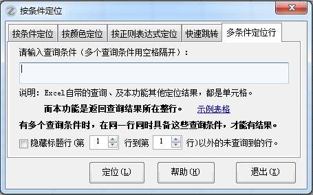(1)增加了【多条件定位行】的选项卡,Excel自带的查询、及本功能其他定位结果,都是单元格。而本功能是返回查询结果所在行。在存在多个查询内容的情况下,就返回同时具备这些查询结果的行。