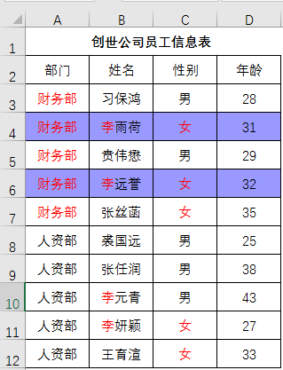 在下面的表格中, 输入的查询条件: 财务部 李 女 ,就会发现:第4行,第6行被选中