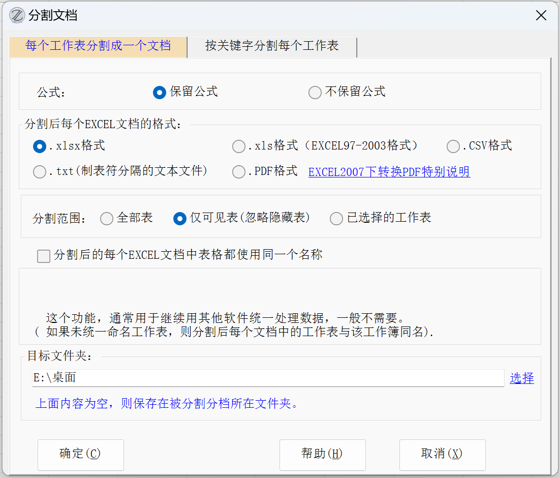 16.20版改进:增加了仅分割“已选择的工作表”的选项。