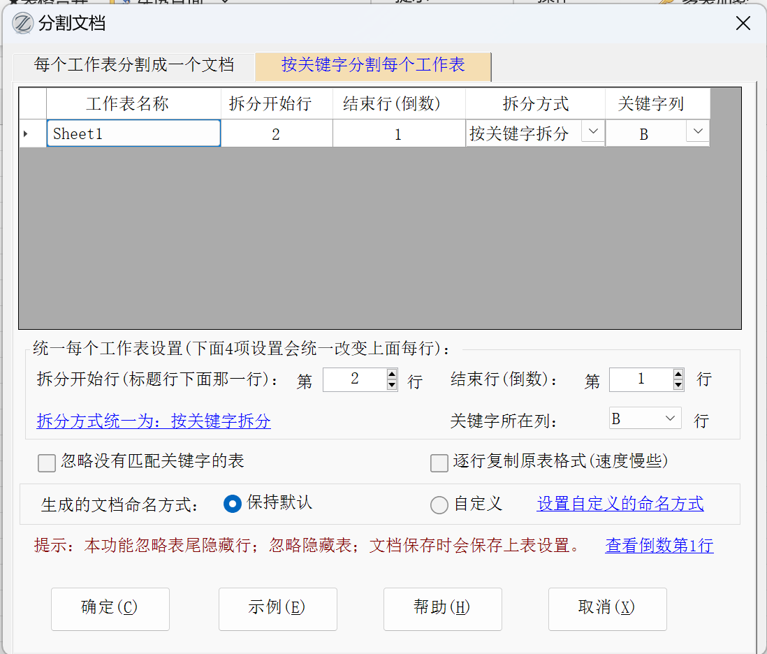 18.32版改进:增加了【按关键字分割每个工作表】选项卡,可以将一个工作簿(含有多个工作表),按关键字拆分成多个工作表(含有多个工作表),为了便于你快速上手,还贴心提供了示例!