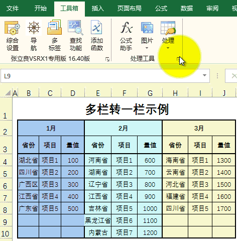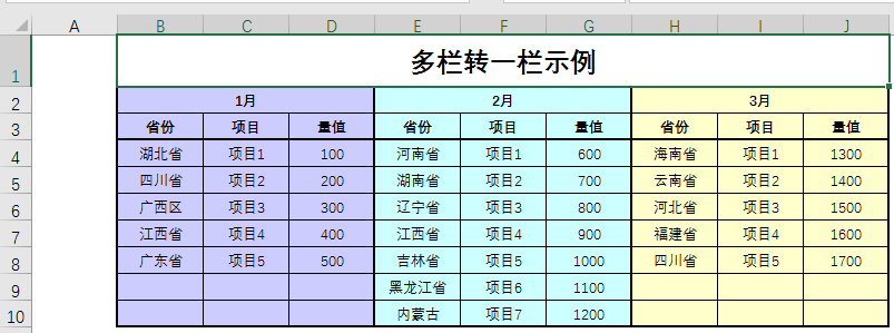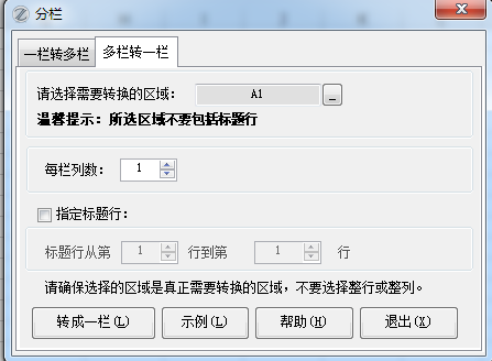 选择上面的区域B2:J10,打开【分栏】功能的窗口,切换到【多栏转一栏】标签,每栏列数选择3,并点击【转成一栏】按钮,就会得到下面的结果: