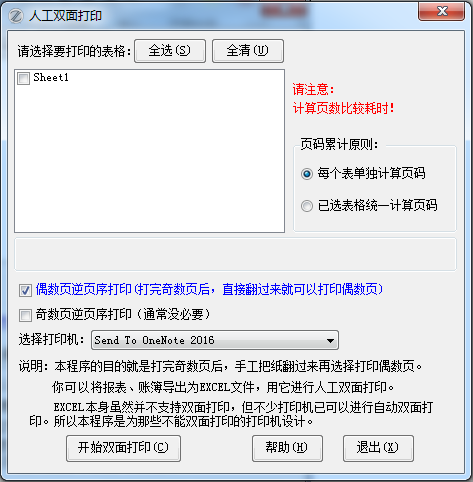 EXCEL本身虽然并不支持双面打印,但不少打印机已可以进行自动双面打印。所以本程序是为那些不能双面打印的打印机设计。