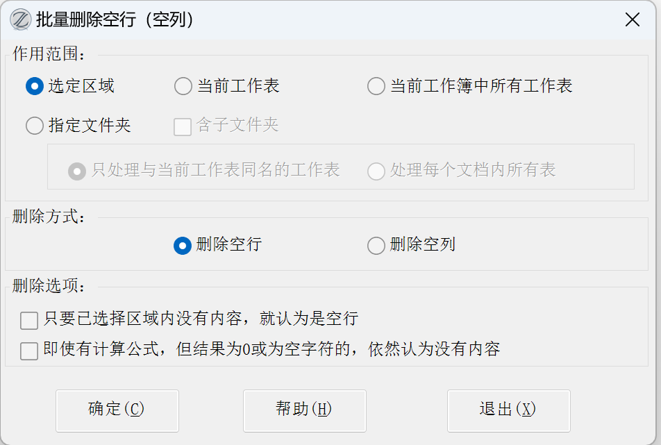 17.81版改进:增加了对指定文件夹进行批量处理的功能,此外,如果没有勾选【选定区域】选项,则【只要已选择区域内没有内容,就认为是空行】选项就会变成不可选,因为该选项只适用于选定区域。