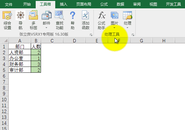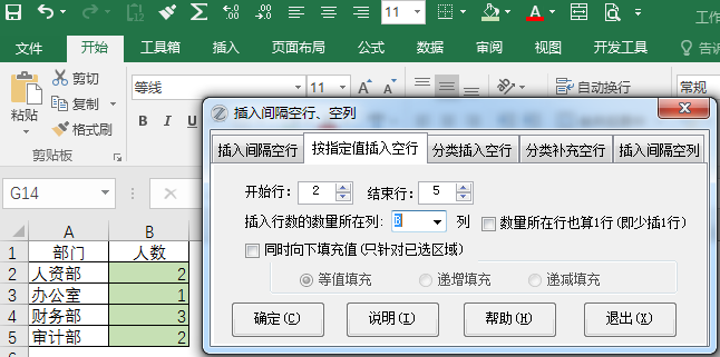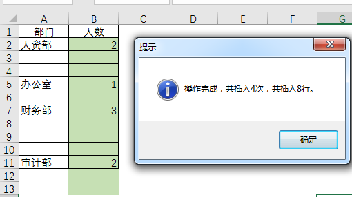 比如:想按照B列人数,多少人就插入多少行,这样人资部下面插入2行,办公室下面插入1行,财务部下面插入3行,审计部下面插入2行: