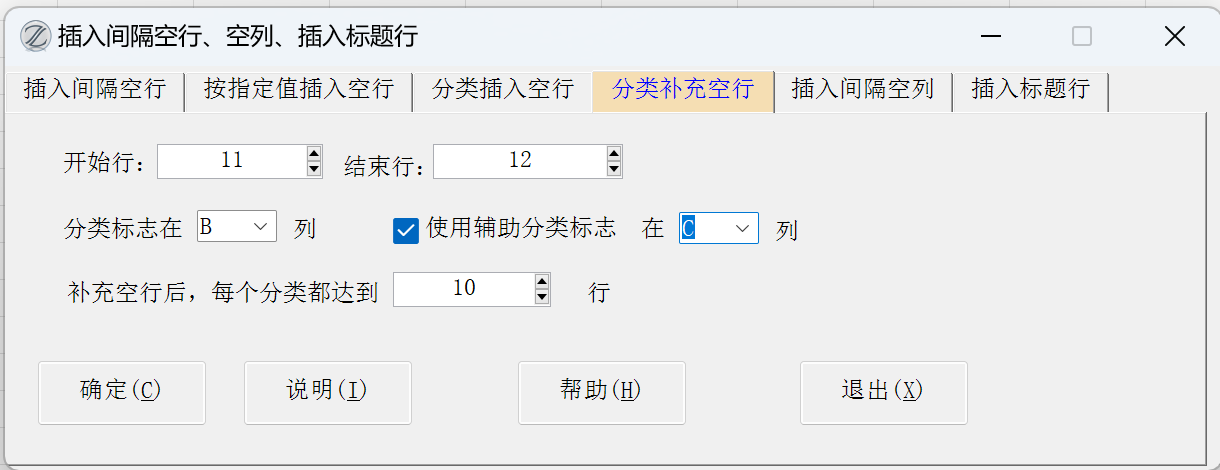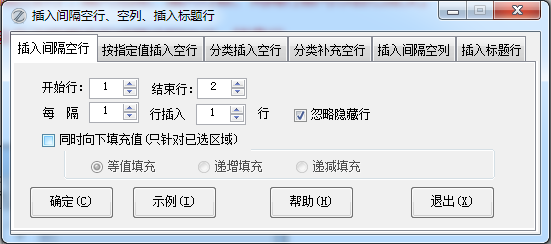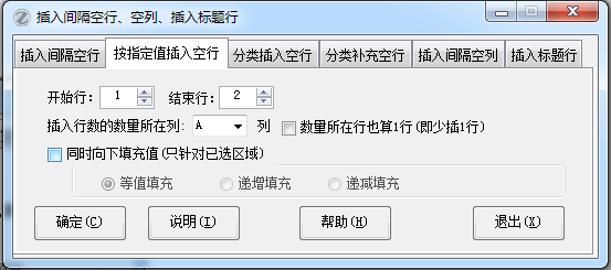 16.30版改进:增加了“按指定值插入空行”选项卡,根据指定列中每个单元格的值,分别插入对应的行数,并提供“等值填充、递增填充、递减填充”三个选项。