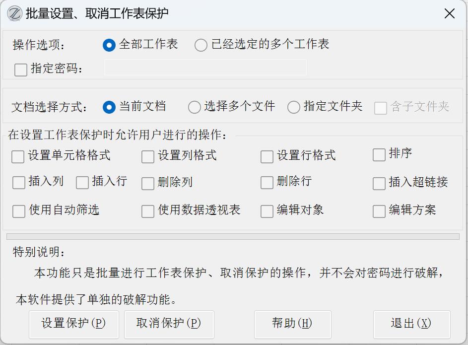 本功能既可以对当前文档,也可以对指定文件夹或选定的多个文档进行批量设置(或批量取消)工作表保护。