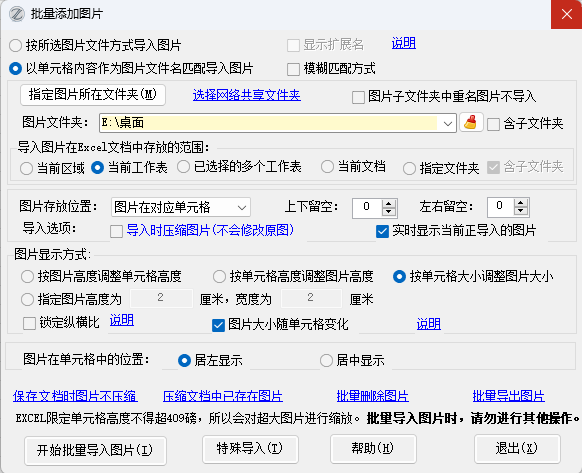 13.60版改进:增加了导入图片是压缩的选项。有些图片很大,实际上在excel中只显示很小的图片。这样在导入很多图片后,excel文档既臃肿又没必要,勾选本选项后,会自动根据显示方式确定的大小压缩图片。