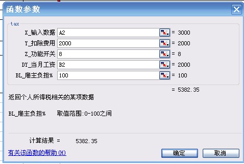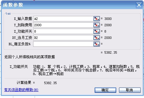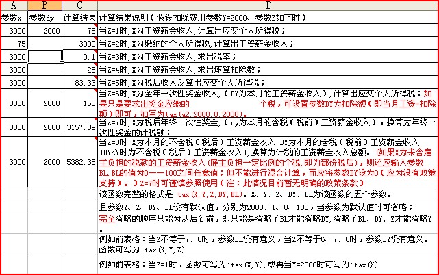X(参数1)为计税工资收入,Y(参数2)为税前扣除额(如为默认值2000不需要输入),Z(参数3)为2。