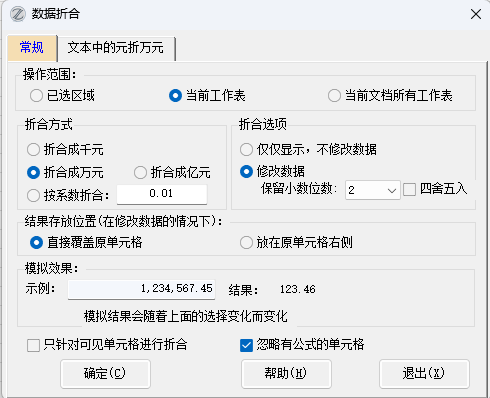 17.11版改进:增加了“忽略有公式的单元格”选项,界面上增加了所见即所得折合结果示例;有公式的单元格,在按“系数折合”时,应该是原有公式乘上折合系统,已经改进。