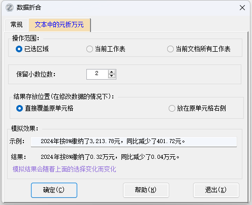 18.64版改进:新增【文本中的元折万元】功能,比如,可以将单元格内容“ 2024年按8%缴纳了3,213.78元,同比减少了401.72元。”,转换成:2024年按8%缴纳了0.32万元,同比减少了0.04万元。