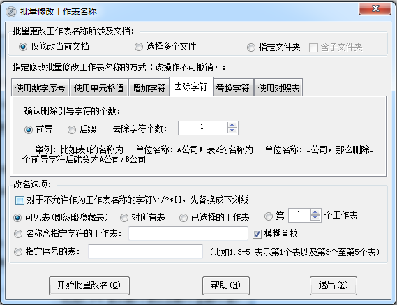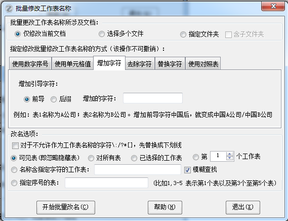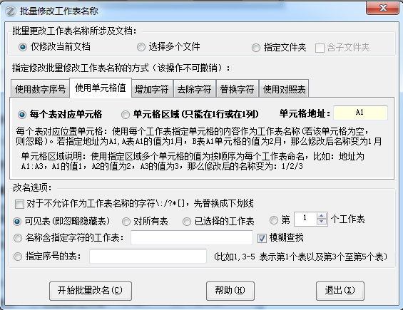 原来功能是对所有工作表进行操作,现在增加了选项,可以只对已选择的工作表进行批量更名操作。