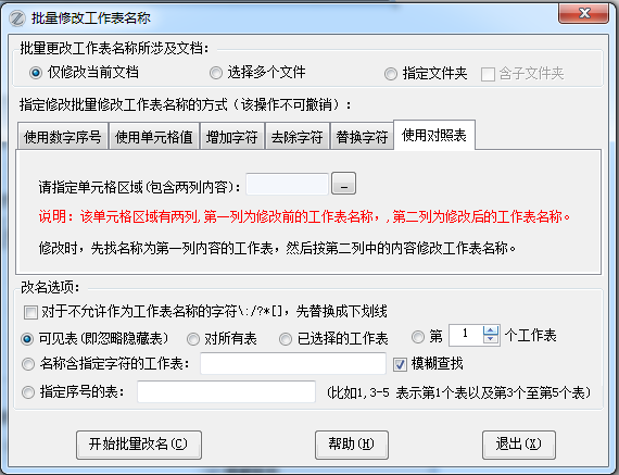 (2)增加了需改名工作表的选择,更加方便只对特定工作表改名。