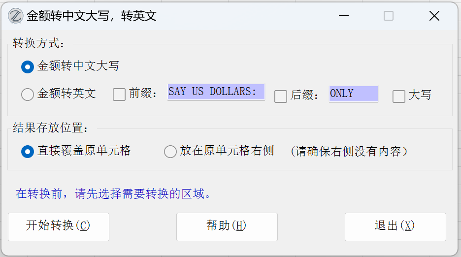 18.75版改进:功能全面改进,既可以批量将金额数字转换成中文大写,还可以转换成英文大写(或仅首字母大写),满足外贸用户的需要。