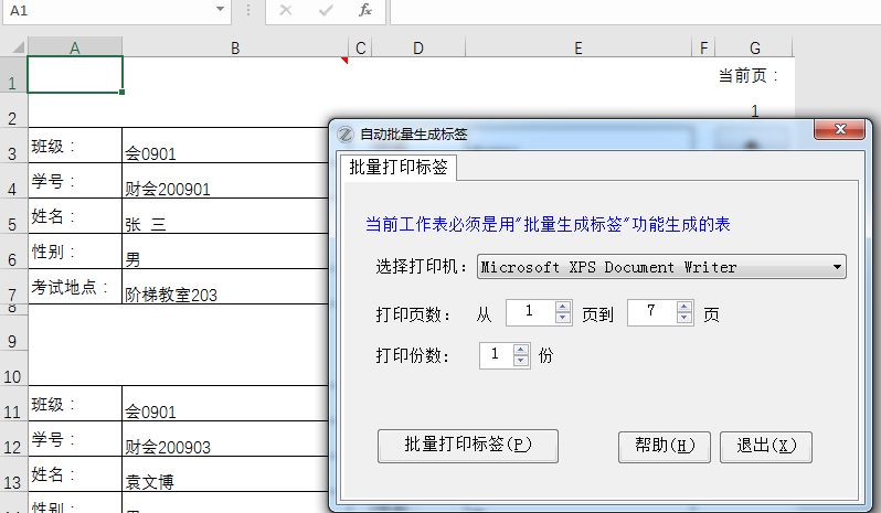 提醒:确保当前工作表是如上图那样的标签表,然后再次点击“模板计算”按钮,会弹出窗体,点击“批量打印”按钮,就可以批量打印标签了: