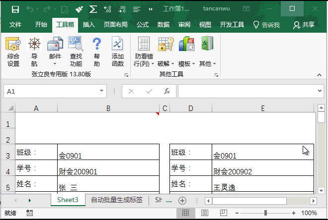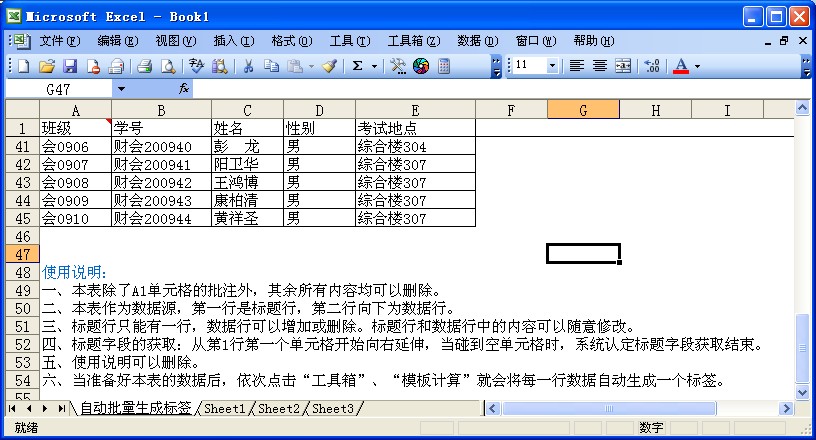 系统会自动增加一个“自动批量生成标签”工作表,并提供了测试数据(测试数据可以修改)