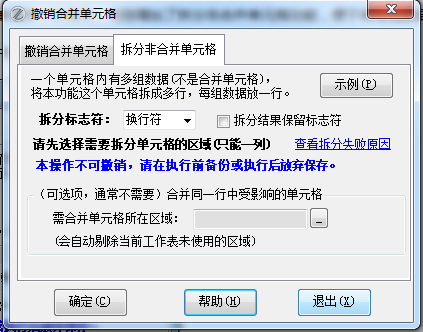 (2)增加了“拆分非合并单元格”界面,可以将一个单元格中有多行数据的这种单元格拆分成多个单元格(通过插入行来),这样每行数据存放在一个单独的单元格中。