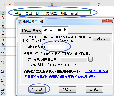 用本功能,拆分标志符选择逗号(也可以自己输入):