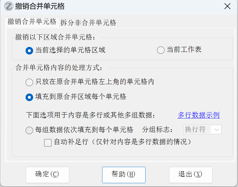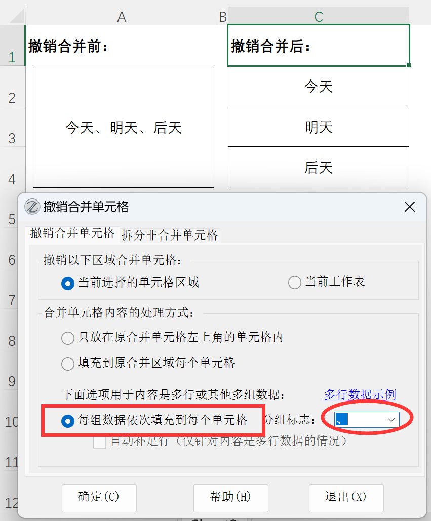 17.81版改进:增加了“每组数据依次填充到每个单元格”选项,可以将合并单元格里原有多组数据分别放到每个单个格。