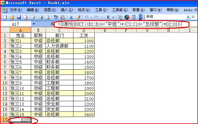 =SUMPRODUCT((B2:B16="中级")*(C2:C16="总经部")*D2:D16)