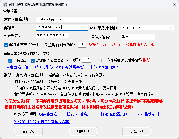 13.35版改进:支持正文html格式,同时设置界面更加易懂,并增加了腾讯企业邮箱设置的介绍。