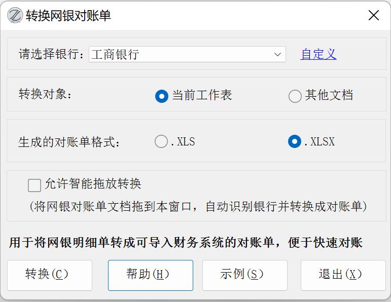 17.71版改进:增加了“允许智能拖放转换”选项,将网银对账单文档拖到本功能窗口,就能自动识别已支持的银行并转换成对账单。