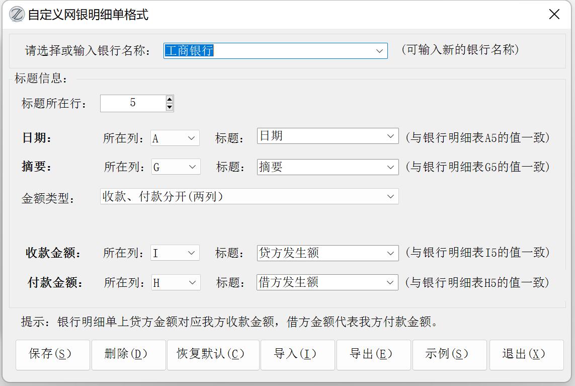 如果你的网上银行不在上述范围,或者财务系统对账功能不接受“单字段格式”,通过自定义也不能满足你特殊要求,请提供相关示例数据,用于对本功能进行完善。