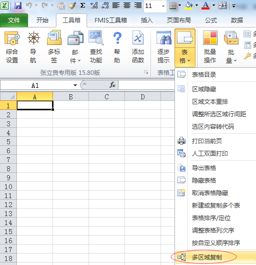 2、进入EXCEL必备工具箱主界面:点击“多区域复制”
