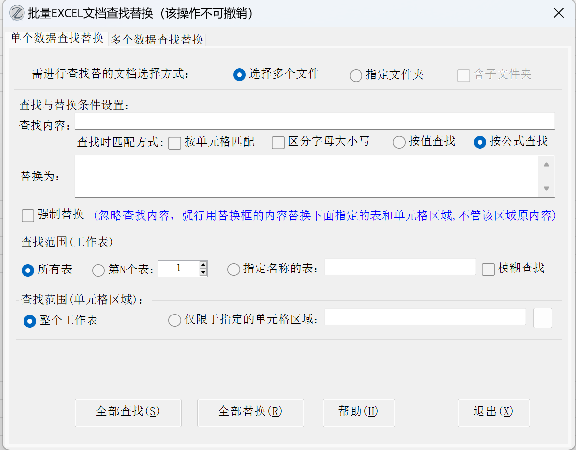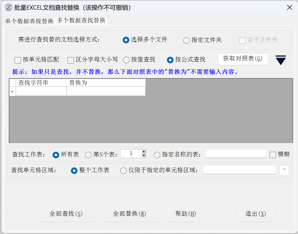 功能介绍:在同一文件夹中进行批量查找替换。可以选择指定的表格、指定的单元格区域、是否包含子目录,是否按值替换(突破了EXCEL自身只能按公式替换的不足),而且所有查找及替换结果全部以列表展示,让你一目了然。特别贴心的是,可以按照对照表,对多个值依次进行替换。