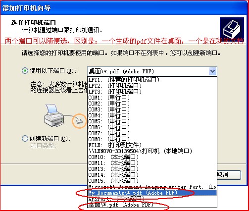 1、手动在控制面板添加打印机,选择连接到此计算机的本地打印机,并取消自动检测并安装即插即用打印机选择,端口选择Adobe PDF,如果没有这个端口,则选择创建新端口。