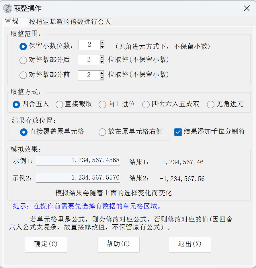 15.74版改进:增加了可视化界面和动态示例;增加了直接截取和四舍六入五成双模式,增加整数位取整的方式,并增加了将数据取整结果“放在原单元格右侧”的选项。