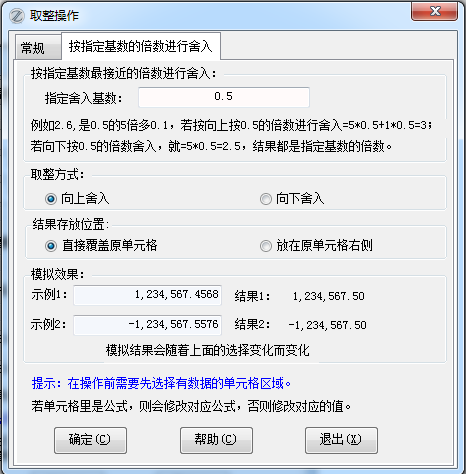 17.10版改进:增加了“按指定基数的倍数进行舍入”选项卡,便于按指定基数的倍数进行向上舍入或向下舍入。
