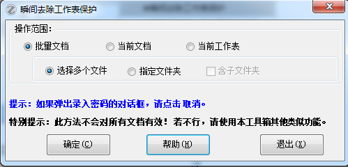 16.80版更新:增加了批量文档处理,可以按选择的多个文件或指定的文件夹进行批量去除工作表保护。