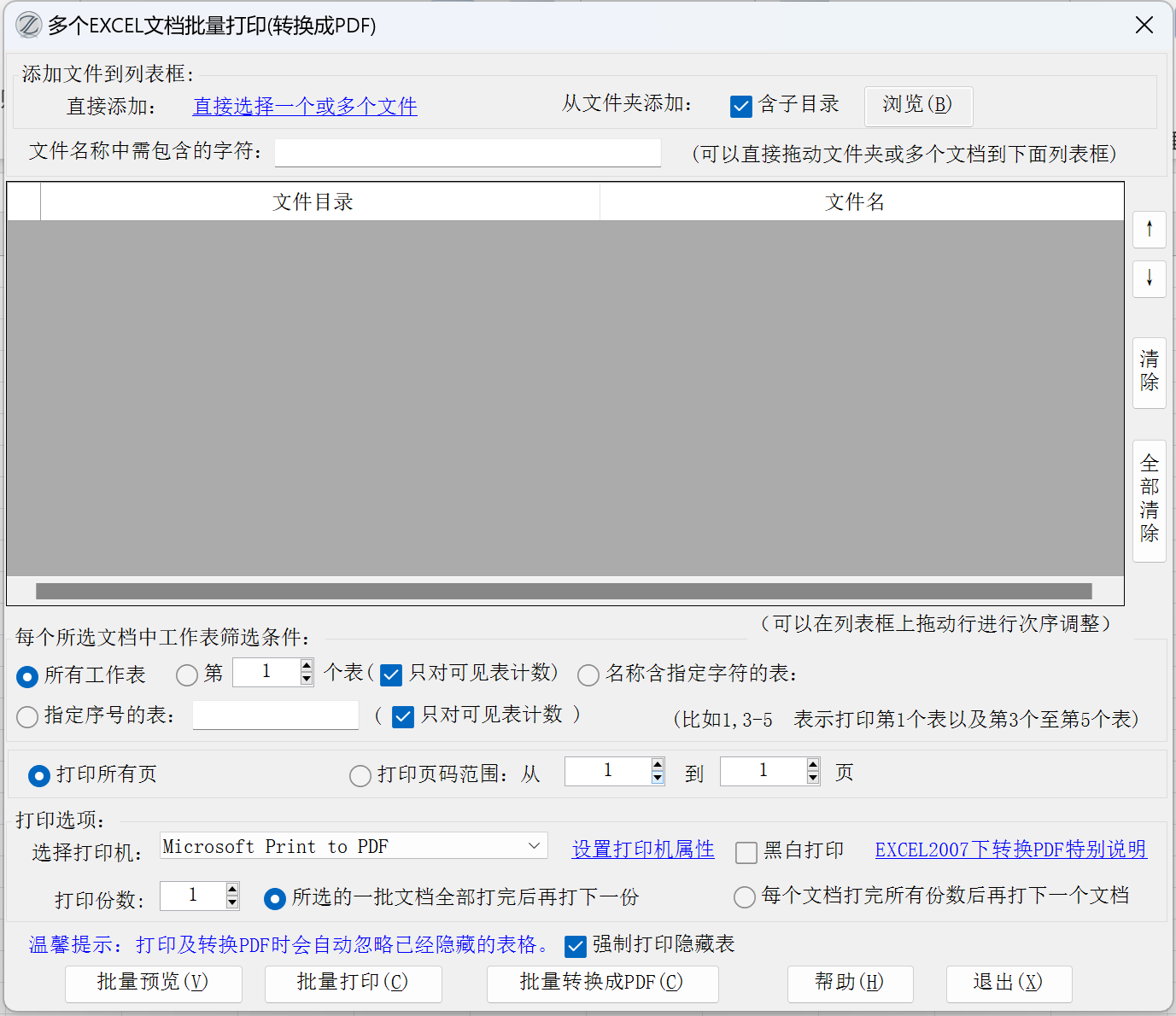 可通过拖动文件、文件夹到列表区进行批量打印,列表区的文件可以通过拖动调整位置,可以通过指定字符进行筛选文档,也可以指定只打印各文档中符合条件的工作表。