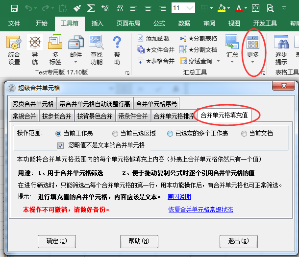 本功能是利用excel合并单元格的bug来实现的,既然是bug,就有使用限制,因此请确保这些需要填充值的合并单元格里面的数值不参与合计运算。
