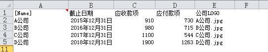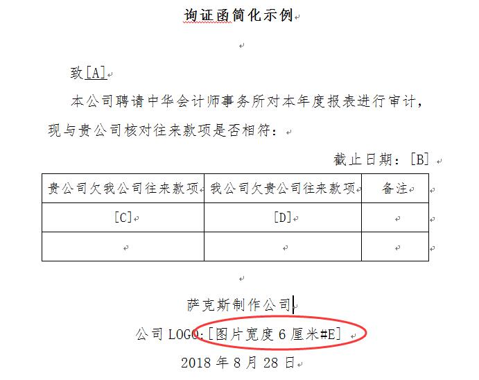 (1)在Word模板中,设置数据来源是这样的,比如:[图片E],可以发现比上面的只是获取一般数据增加了图片两个字,在当前EXCEL表中对应列,这里是E列就需要输入图片的名称,比如:A公司.jpg(由于没有写明图片文件所在文件夹,所以会自动从当前EXCEL文档所在文件夹查找该图片文件),或者直接写上带文件夹的文件名,比如:D:\图片\A公司.jpg,如图: