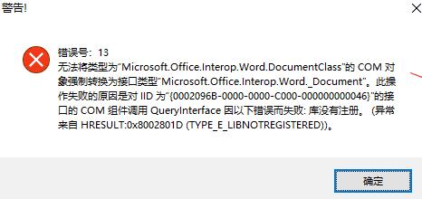 无法将类型为“Microsoft.Office.Interop.Word.DocumentClass”的COM 对象强制转换为接口类型“Microsoft.Office.Interop.Word._Document”。此操作失败的原因是对IID 为“{0002096B-0000-0000-C000-000000000046}”的接口的 COM 组件调用QueryInterface 因以下错误而失败: 库没有注册。 (异常来自 HRESULT:0x8002801D(TYPE_E_LIBNOTREGISTERED))。