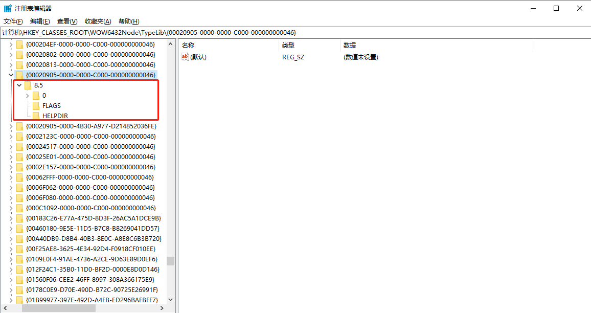 再到注册表这个位置:计算机\HKEY_CLASSES_ROOT\WOW6432Node\TypeLib\{00020905-0000-0000-C000-000000000046}