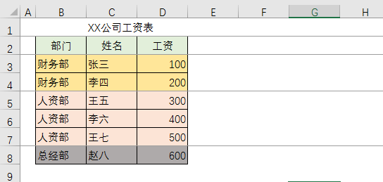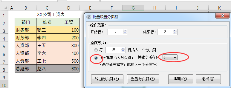 比如,希望按B列的部门为标志,每个部门下面添加一个分页符: