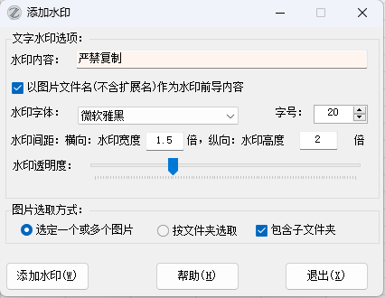 18.76版更新:增加了【以图片文件名(不含扩展名)作为水印前导内容】选项,便于以图片名作为水位内容。